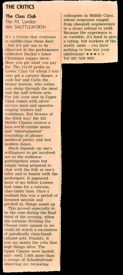 | | | 21 January 2006The Class ClubIan Shuttleworth: Finanacial Times Hotline: +44 (0)20 7737 4043 info@duckie.co.uk Stay connected with Duckie: Join Duckie's A-list.